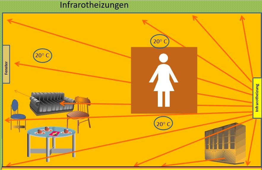 C) Infrarotheizungen sind Direktheizungen und werden auch Wärmewellenheizung genannt. Sie besitzen keine stromfressenden Heizspulen und verbrauchen bei gleicher Wärmelieferungen bis zu 70 % weniger Stromkosten gegenüber Elektroheizungen, beispielsweise Nachtspeicheröfen. Im Weltraum heizen Infrarotheizungen durch Elektronen-Reibungswärme. Die Wärme wird gleichmäßig im Raum verteilt und erreicht auch die Ecken von Wand und Decke. Überall ist die gleiche Temperatur.